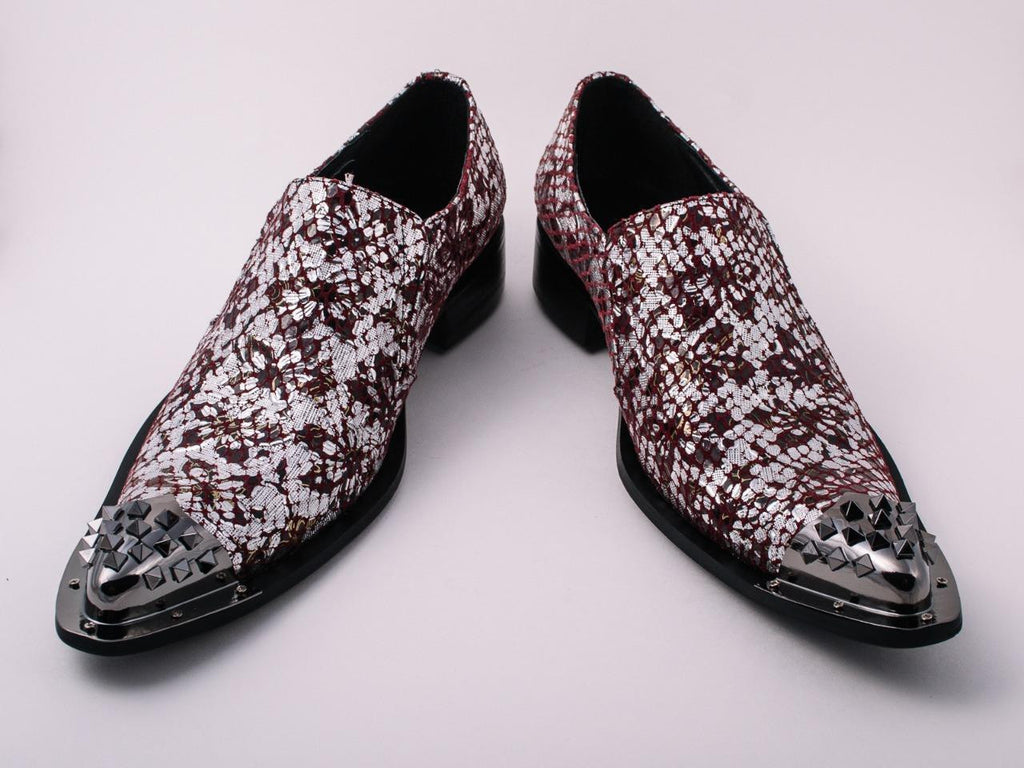New men's red Fiesso silver foil pointed metal toe slip on shoes with spikes fi 6842. Leather shoes with spiked metal tip and stud.