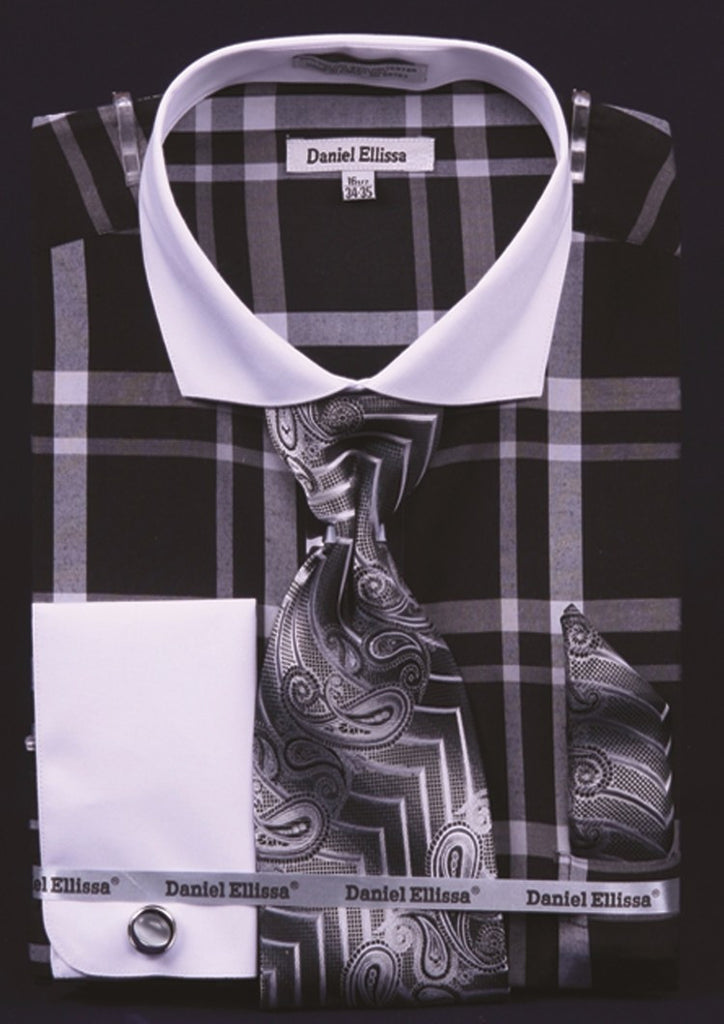 Daniel & Ellisa DS3771P2 Men's Checker Pattern French Cuff Shirts with Cuff Links
