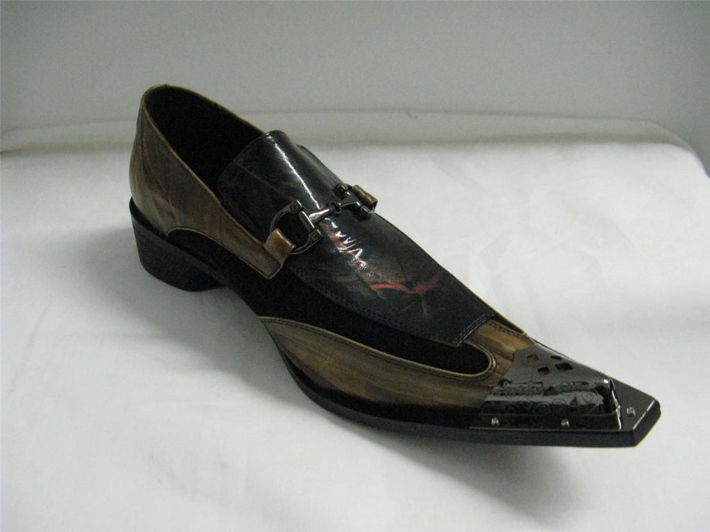 New arrivals!!! Fiesso brown two tone print suede and leather slipon, metal tip pointed toe shoes. Suede and leather upper and leather lining and man made sole.